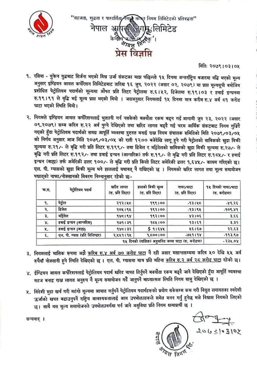 निगमले आइतबार राती एक विज्ञप्ति जारी गरी पेट्रोलको साविकको खुद्रा बिक्री मूल्यमा रु २१ ले वृद्धि गरी प्रतिलिटर रु १९९ सय रुपैयाँ तथा डिजेल र मट्टितेलको साविकको खुद्रा बिक्री मूल्यमा रु २७ ले वृद्धि गरी प्रतिलिटर रु १९२ रुपैयाँ कायम गरिएको जनाएको छ ।